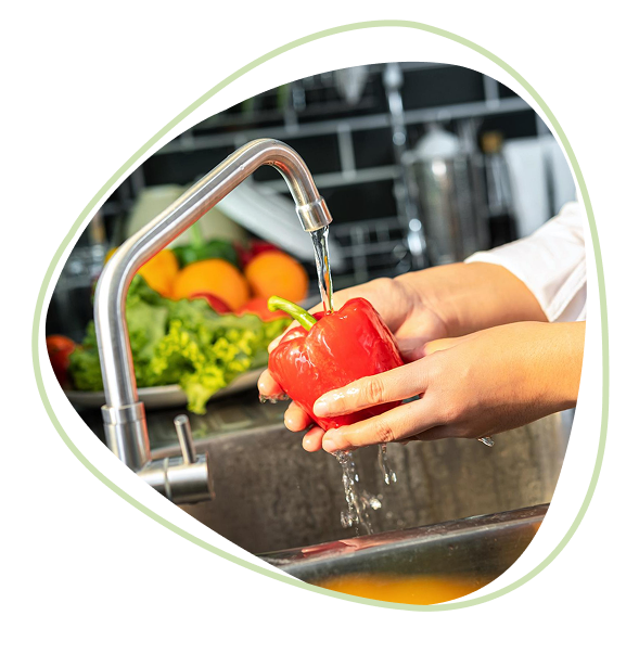 WUSSTEST DU SCHON? Zum Beispiel, dass herkömmliches Abspülen mitunter nur etwa 4 % der Pestizide (Wu et al., 2019) entfernt und dass bis zu 15 % der gefährlichen Krankheitserreger wie Salmonellen, E. coli und Noroviren (Beuchat et al., 1995) auf Obst und Gemüse zurückbleiben können? Natron und Essig entfernen Krankheitserreger zudem nicht besser als gewöhnliches Leitungswasser (Kilonzo-Nthenge et al., 2005), ganz zu schweigen von den Rückständen, die nach der Reinigung zurückbleiben.