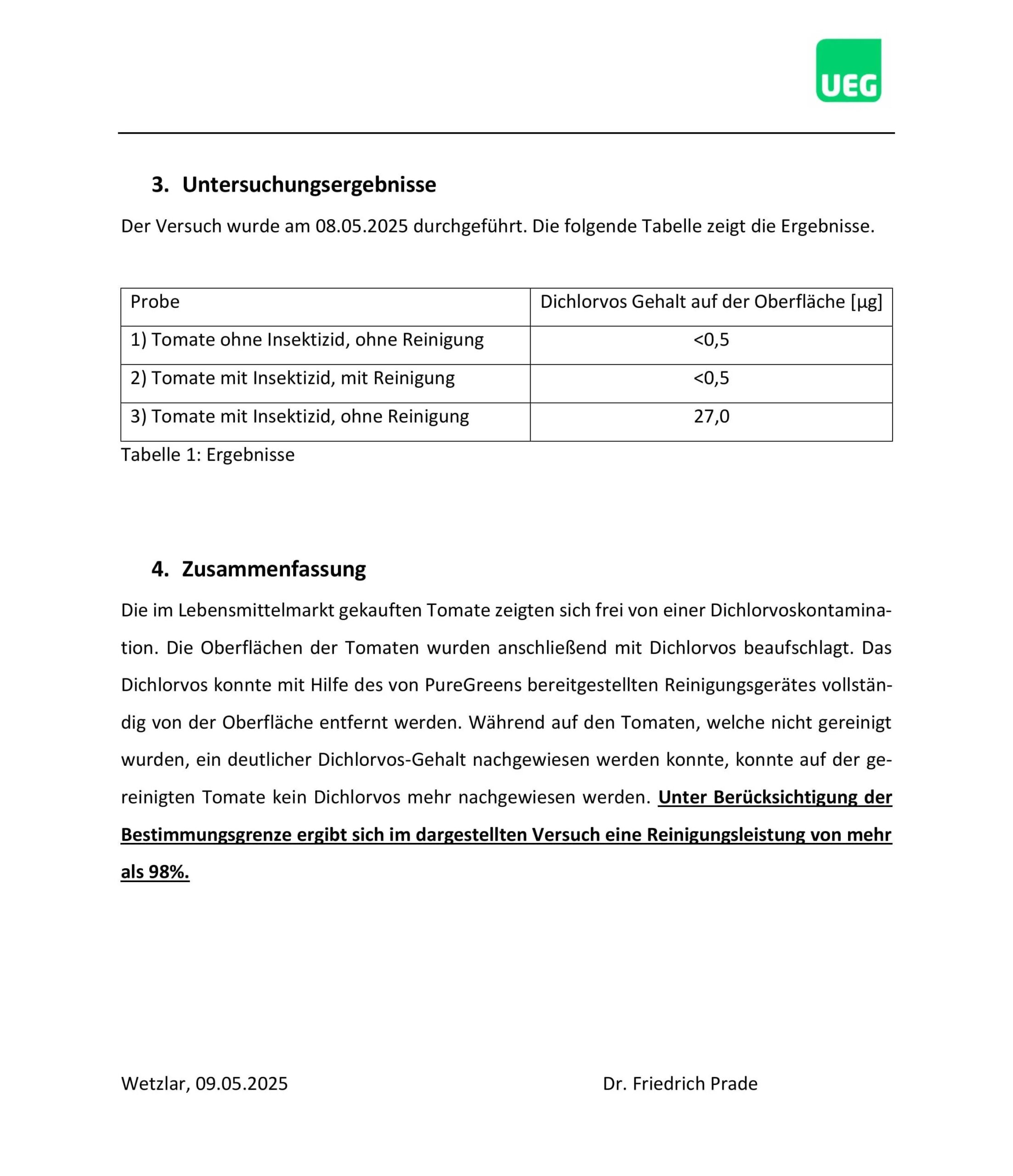 Die UEG GmbH als unabhängiges, deutsches Labor bestätigt die Entfernung von über 98% des Pestizids Dichlorvos durch den PureGreens.